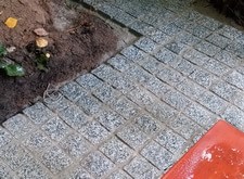 В первую очередь мы убрали старый цветник и уложили брусчатку.