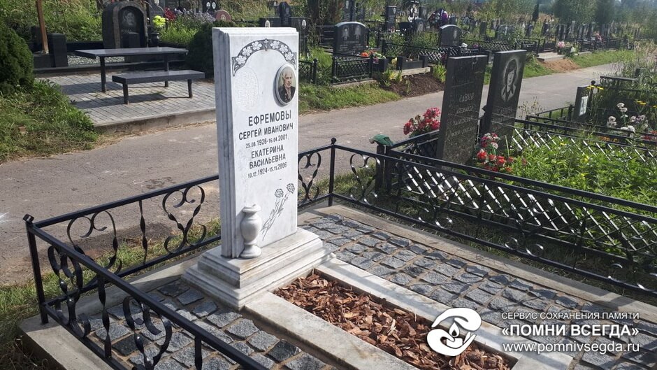 Внутрь бетонного цоколя кладём брусчатку, красим оградку, наполняем цветник корой, надписи на памятнике покрываем чёрным акрилом. Обычно мы кладём наземное покрытие так, чтобы бетонного цоколя не было видно, однако, в данном случае клиент не пожелал переустанавливать ограждение и проводить какие-либо дополнительные работы, так что брусчатка была уложена вовнутрь. Состояние места захоронения после проведения работ представлено на нижеприведённых фото.