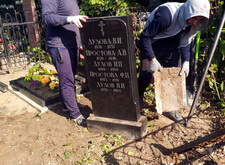 На данном объекте нам предстояло ровно установить покосившийся памятник, а вокруг цветника положить гранитную брусчатку.