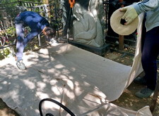 Замываем брусчатку, устраняя белёсые разводы, а также протираем памятник от строительной пыли.